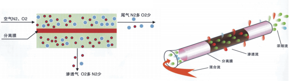 膜分離制氮機(jī)技術(shù)是根據(jù)空氣中的氮氣和氧氣在膜兩側(cè)壓差作用下,在膜中的溶解度和擴(kuò)散系數(shù)不同而實現(xiàn)分離的,滲透率快的水蒸汽、氧氣等一些氣體先透過膜,成為富氧氣體,而滲透率較慢的氮氣則滯留富集,成為干燥的富氮氣體,達(dá)到氧氮分離的目的。
